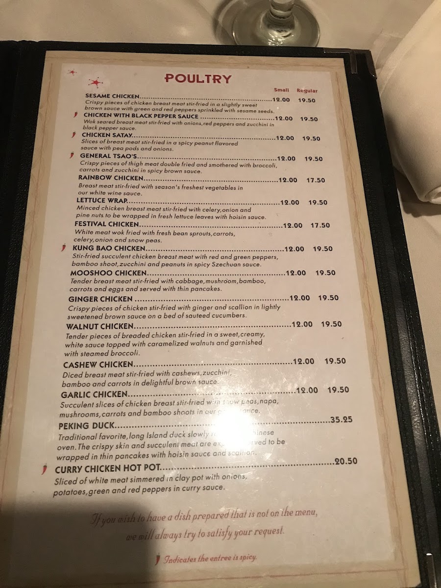 traditional favorite, long island duck slowly roasted in chinese oven. the crispy skin and succulent meat are expertly carved to be wrapped in thin pancakes with hoisin sauce and scallion
